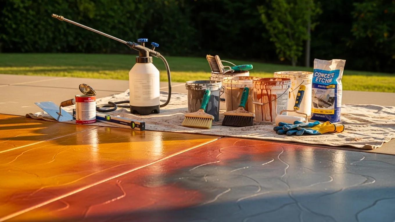Essential tools include a quality applicator (roller or sprayer), concrete cleaner, etching solution, protective gear (gloves, goggles), and a moisture meter to confirm readiness.
